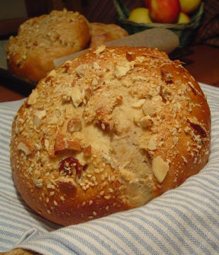 Ekmeklerin üzerine fırçayla yumurta akını sürüp file badem ve susamla süsleyin.