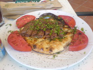 Kenarlarını sarkıtalım. Ilık kebaptan delikli bir kepçeyle alıp, krepin ortasına koyalım.