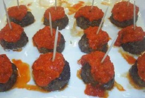 üzerine kızartılmış köfteleri dizin ve köftelerin üzerine kırmızı biber sosundan dökün.