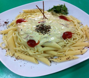Makarnalarımızı Pişirme dakikasına uygun haşladıktan sonra az katı ve sıvı yağ ile karıştırdığımız makarnalarımızın üzerine kuru soğanlı sarmısaklı yine rendeli kızarmış sebzeleri tavadan alıp beyaz soslarla hafif çırpma yapıyoruz. kuru mlz.ekleyerek tabağa koyduğumuz makarnanın üzerine soslarımızı tepe şeklinde aktarıyoruz. ince doğranmış maydanoz uda süsleme yapıyoruz…