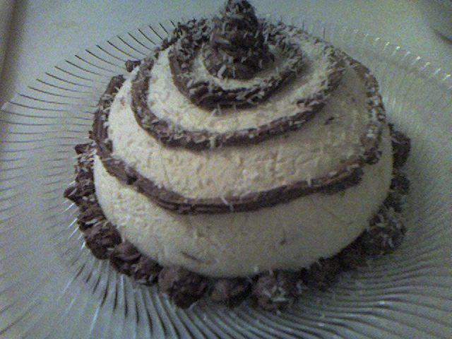 Parfeyi çıkarıp üzerini süslemek için ayrılan kakaolu karışımla süsleyip parfeye hindistan cevizi serpiştirip, dilimleyerek servis yapın.