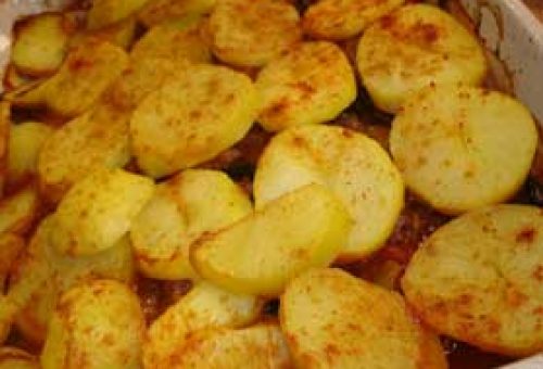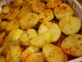 Sos koyulaşıp malzemeler pişince bir fırın kabına aktarılıp , haşlanmış halka patatesler üzerine dizilir.