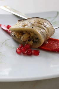Patlıcanların içine nohutlu içten yayıp sarın.