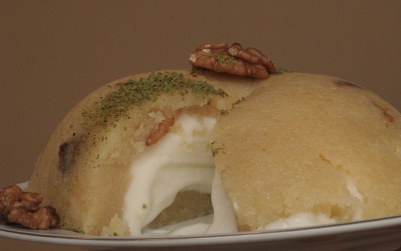 Üzeri tekrar helva ile kaplanır ve bir tabağa ters çevrilir.