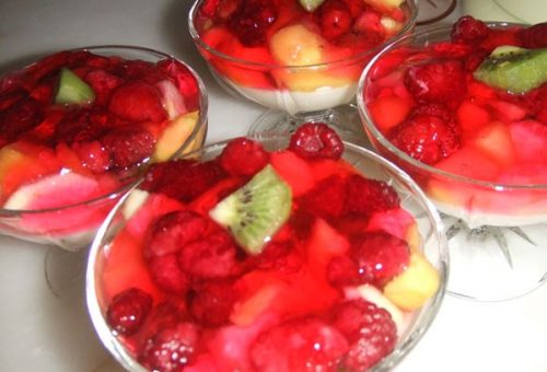 Üzerine bir pakey çilekli jöleyi tarif göre yaparak kaşık yardımıyla paylaştırın.