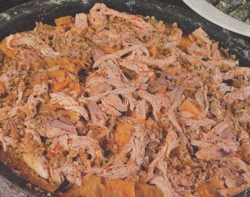 Pişen tavuğun suyunu ayrı bir tencereye alın, tavuğu iyice didikleyip karabiberle harmanlayın.