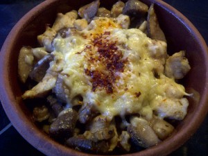 Tavuklar kızarınca, doğranmış biber, ve dörde bölünmüş mantarları ilave edelim.