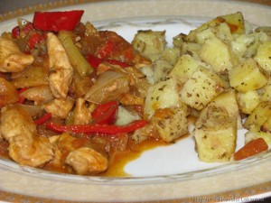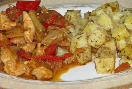Biber,domates ve sarımsağı irice doğrayıp sıvıyağda baharatlarla beraber birkaçkez karıştırıp patates ve tavukları da ilave edip ocağın altını kısın.